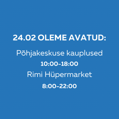 17.02.2026 24.02.26 Keskuse avamisajad Põhjakeskuse kauplused: 10:00-18:00 Rimi Hüpermarket: 8:00-22:00