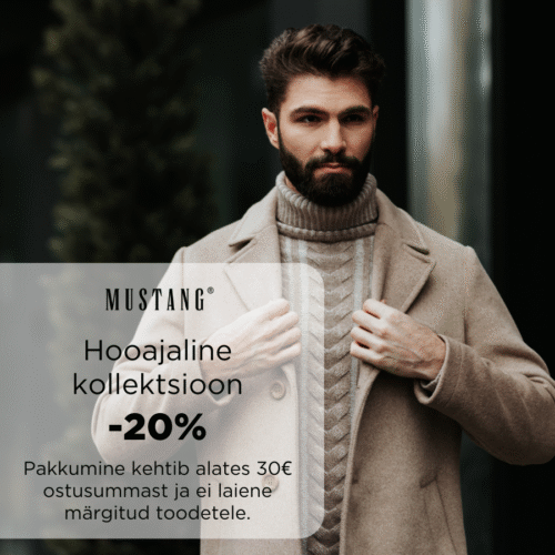 09.-12.10 Hooajaline kollektsioon -20% Pakkumine kehtib al. 30€ ostusummast ja ei laiene märgitud toodetele. Mustang Teised kampaaniad 04.-11.11 Osta 2 toodet ja saad -25% 03.-09.11 Meeste ehted ja käekellad -20% 03.-30.11 Püsikliendiprogramm Salon+ salongis 03.-23.11 Talvejoped ja -saapad kuni -25%! 01.-30.11 Kuupakkumine – Vahvliburger 01.-30.11 Kõik Deli Sketšmarkerite komplektid -30% 01.-30.11 Püsikliendi pakkumine! 20.10-12.11 Kõik voodid ja madratsid vähemalt -20%