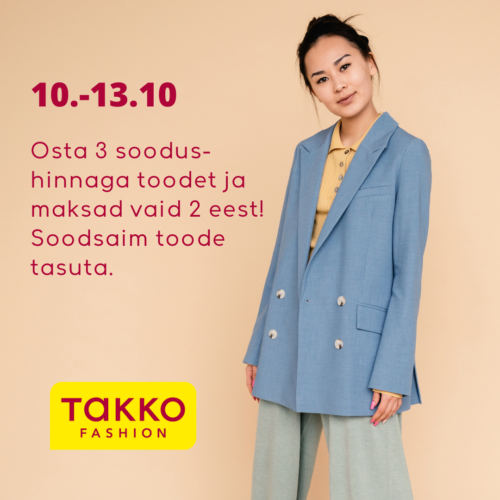 Takko Fashion 10.-13.10 Osta 3 soodushinnaga toodet ja maksad vaid 2 eest Teised kampaaniad 07.04-03.05 Jooks algab Rademarist! Telia Moodsale 06.-12.04 Välkmüük Telias! Rademar Moodsale Karupoeg Puhh Moodsale Weekend Sinsay Juku/Kidzone 04.-30.04 Suur valik aiamööblit -20% kuni -60%! 06.-19.04 Kogu kaup -20%! CoffeeIn&Yo Moodsale Denim Dream Moodsale Goldtime Moodsale Expressions Moodsale Sokisahtel Moodsale Sportland Moodsale Mileedi Moodsale Eagle Vision Moodsale 03.-26.04 Ostes 2 laste jalatsipaari*, teine -50% soodsamalt! 01.04-03.05 Vabaajajalatsid Rademarist 01.04-03.05 Kevadjoped Rademarist 01.-30.04 Aprilli kuujook – Pistaatsia Latte / Ice Latte 01.-30.04 Paljud ilu- ja tervisetooted kuni –50% 01.-30.04 IsaDora tooted alates -25% 01.-30.04 Valitud pusled -25% 01.-30.04 Püsikliendi lemmikud -25% 01.-30.04 Hesburgeri kuupakkumine – Mini-kanaburger ja juustuburger 01.-30.04 Tooted meestele -20%! 01.-19.04 Valik kellabrände -20% 01.-30.04 Kõik Stick’n tooted -25% 01.-12.04 Valik ilutooteid kuni -50% 16.03-28.06 Raamid või klaasid -50%! 16.03-30.04 Eagle Visionis nägemiskontroll optometristi juures 0 €!